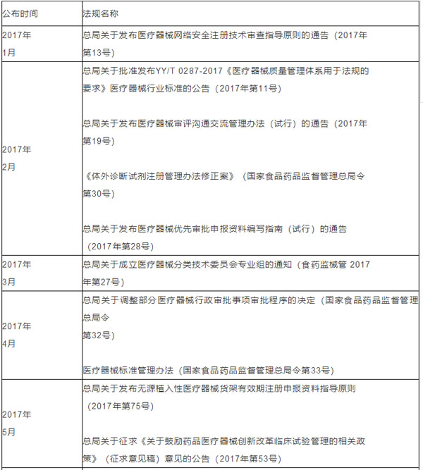 2017年是醫療器械法規快速更新的一年。在這一年中,國家食品藥品監督管理局(CFDA)和醫療器械審評中心(CMDE)出臺了大批量的新法規及指導原則,覆蓋多個領域,包括加快審批、鼓勵醫療器械創新、完善注冊辦法、加強臨床試驗管理、提升技術能力等多方面。