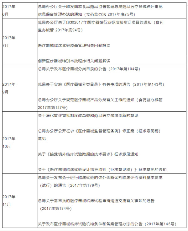 截止到2017年11月底,共發布醫療器械相關的公告超過20個,尤其是10月8日頒布《關于深化審評審批制度改革鼓勵藥品醫療器械創新的意見》后,為貫徹落實新規,繼續發布了6份相關的征求意見稿和3個決定,涉及境外臨床試驗數據、審評審批效率、鼓勵創新等多個方面。