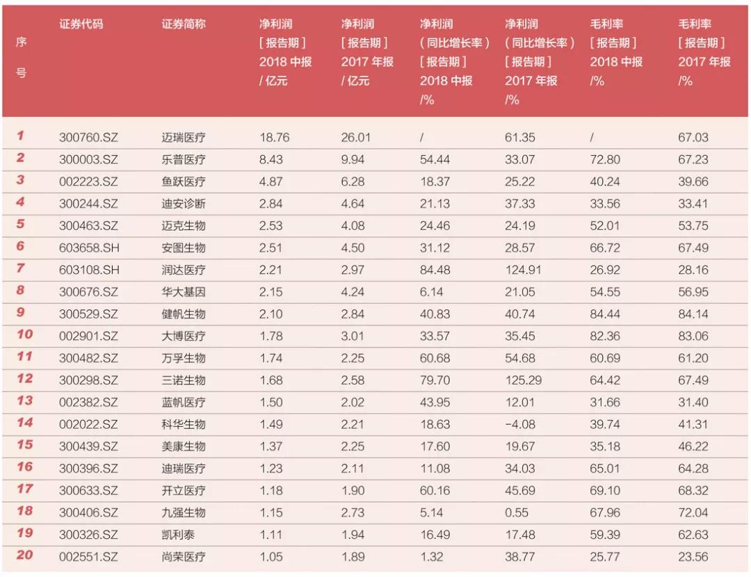以下是梳理出的A股上市醫療器械公司按2018年上半年凈利潤的排名。