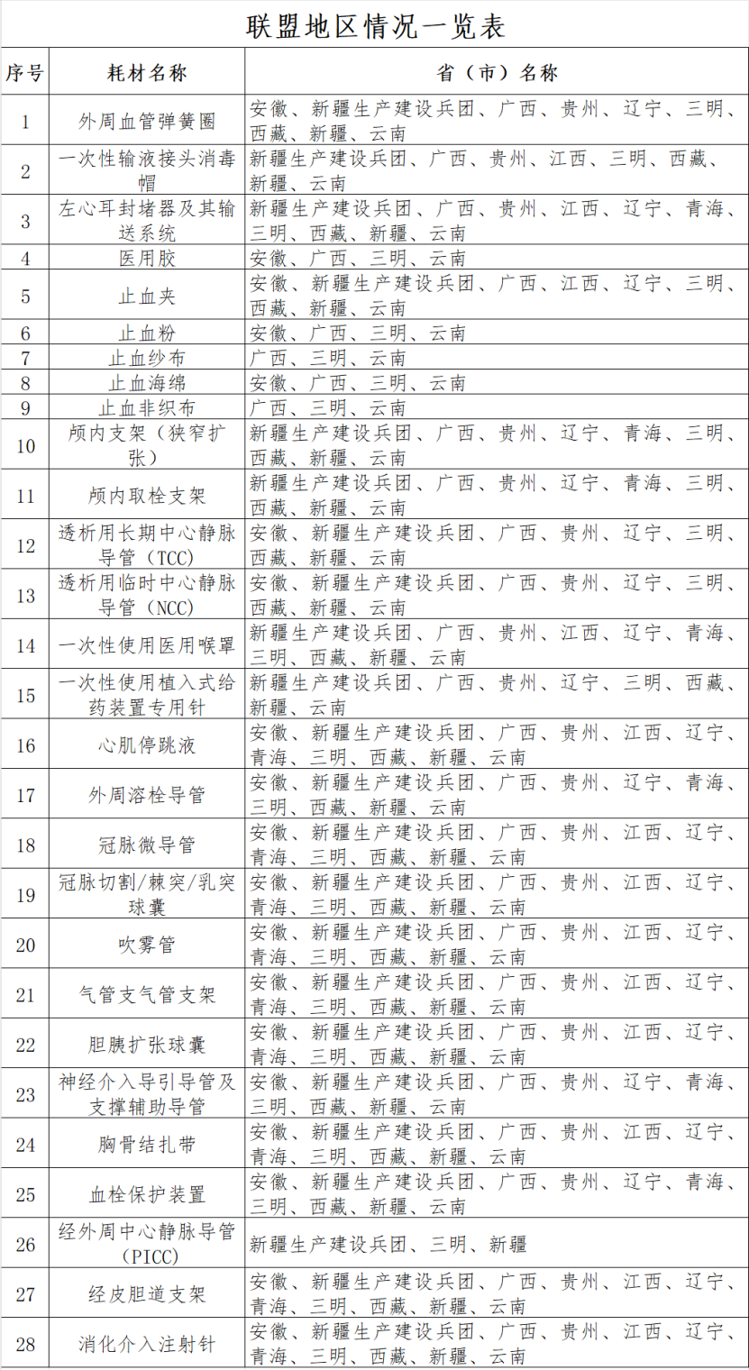 此次聯盟集采共覆蓋28種耗材,涉及外周介入、止血材料、神經介入、透析材料等諸多品類,參與地區超10省,形成了一定規模。