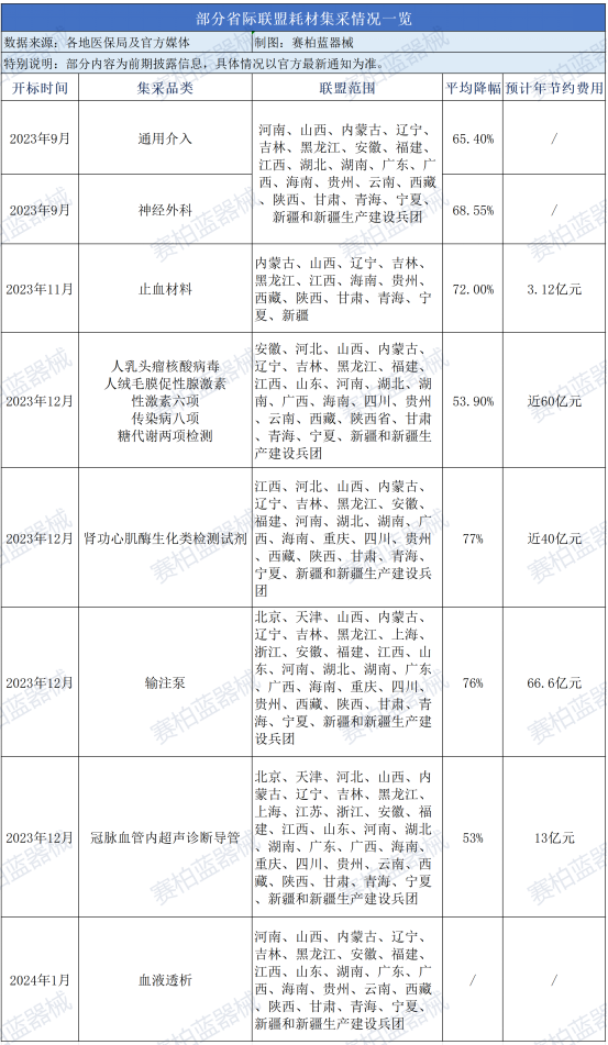 去年下半年至今,人工晶體和運動醫學國采、通用介入和神經外科集采、止血材料集采、安徽等25省體外診斷集采、生化試劑集采、輸注泵和冠脈血管內超聲診斷導管集采、血液透析集采等,多個重磅耗材省際聯盟集采接踵而至。