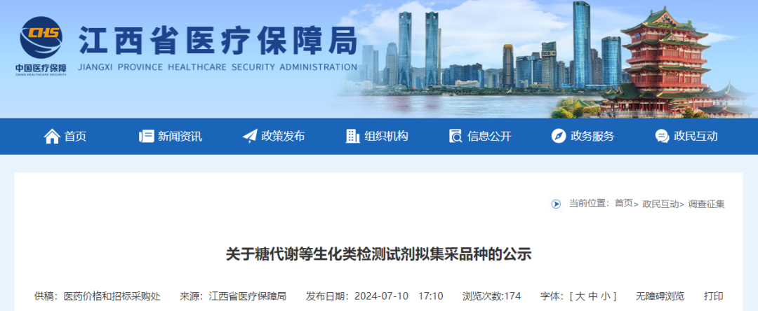 7月10日,江西醫保局發布《關于糖代謝等生化類檢測試劑擬集采品種的公示》。