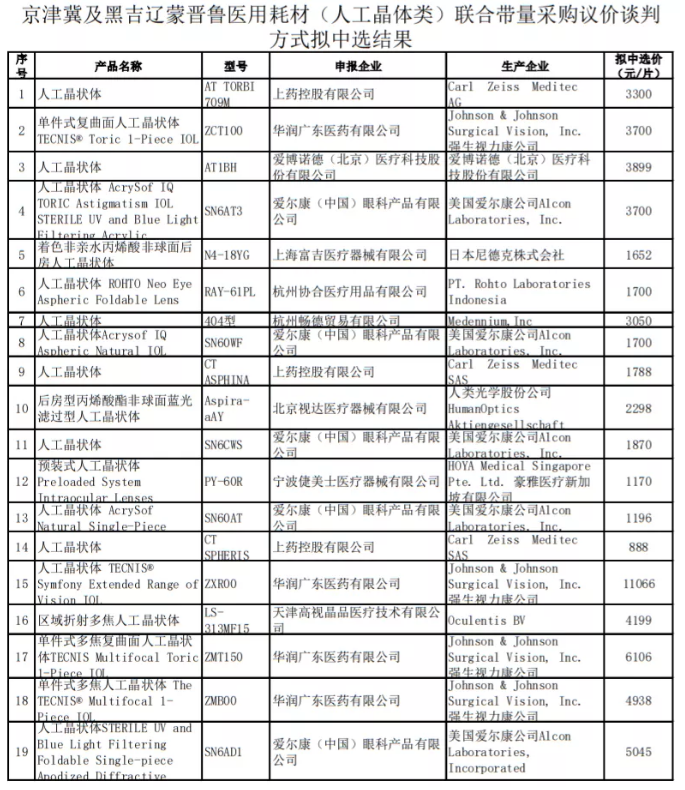 5月18日,京津冀醫(yī)用耗材聯(lián)合采購平臺發(fā)布《京津冀及黑吉遼蒙晉魯醫(yī)用耗材(人工晶體類)聯(lián)合帶量采購議價(jià)談判方式擬中選結(jié)果公示》,公布3+6耗材談判中標(biāo)械企及價(jià)格。