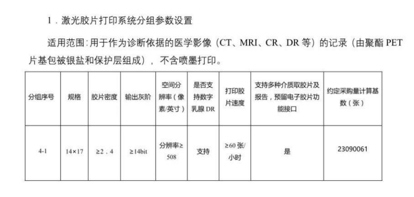 點評:對激光膠片的要求竟有六項之多,這是在以前的招標中前所未有,14*17的膠片是最常用的,CT和MRI必須用14*17的,DR可以用其他尺寸的,比如10*12,8*10。分辨率大于508的醫用膠片是高端產品,低于508dpi是低端產品。最重要的是含銀的醫用膠片都是進口的如銳柯,富士4000,柯尼卡,采用干式直熱成像技術,而國產激光膠片主要是采用的激光轉印技術。噴墨膠片因為價格很低對進口膠片的威脅很大,搶占不少進口膠片的市場份額。