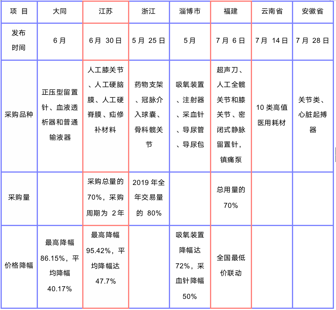 2020年3月中旬國家醫保局曾明確要求要在未來6個月內(即9月中旬前),對11個試點省份(江蘇、安徽、福建、青海、上海、浙江、湖南、重慶、四川、陜西和寧夏)開展高值耗材帶量采購工作,其余23個省份及城市也要積極跟進。