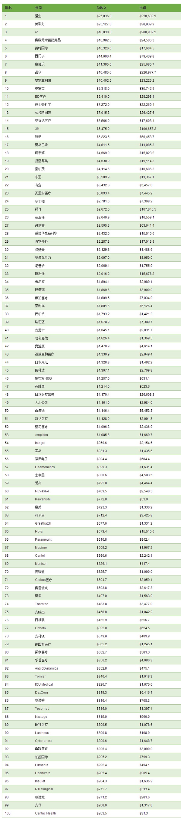 經過幾年的并購潮,全球醫療器械企業企業的排名已經有了些變化,Qmed為此列出了2015年新的百強排行榜,數據來自標普旗下的S&P Capital IQ數據庫。