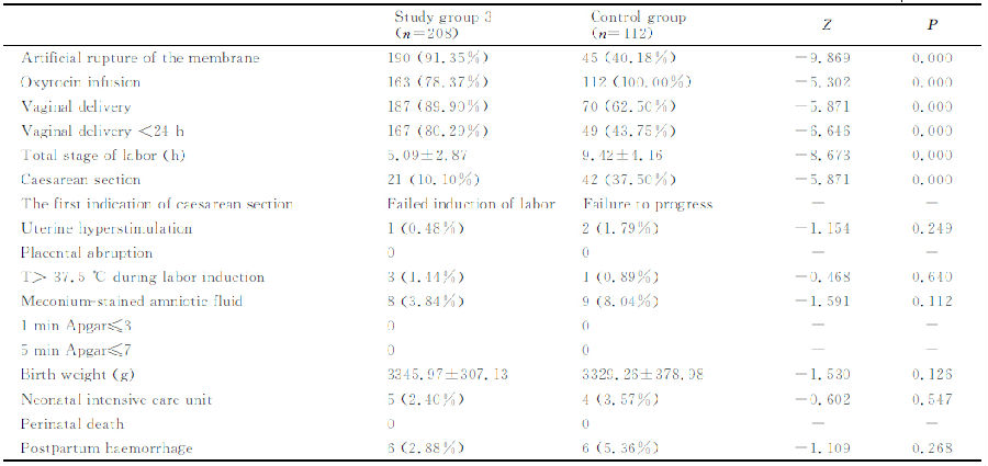 對照組:引產前經(jīng)陰道檢查確定宮頸Bishop評分≥6分,早晨8∶00~9∶00點開始小劑量縮宮素靜滴(使用輸液泵),方法為:縮宮素2U加入500mL晶體液中,以24mL/h開始靜滴,根據(jù)宮縮調整滴速,每15min調整一次,每次增加24mL/h,直到出現(xiàn)有效宮縮(10min內3次宮縮,每次宮縮持續(xù)30s以上)為止,最大滴速為144mL/h。如果達到最大滴速仍然不能誘發(fā)有效宮縮,則增加縮宮素濃度為1U/100mL后重新調整滴速。靜滴縮宮素期間有專人監(jiān)護胎心和宮縮情況等。規(guī)律宮縮8h仍未臨產者,則停止縮宮素靜滴,休息至次晨再次縮宮素靜滴引產。引產過程中酌情人工破膜。