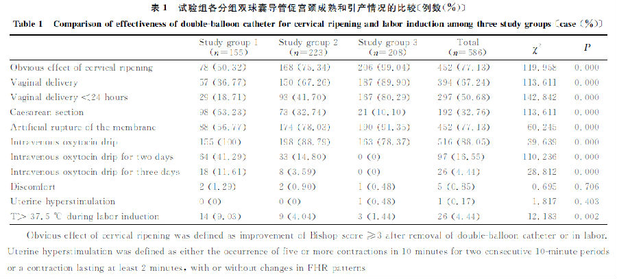 表1 試驗組各分組雙球囊導管促宮頸成熟和引產情況的比較〔例數(shù)(%)〕