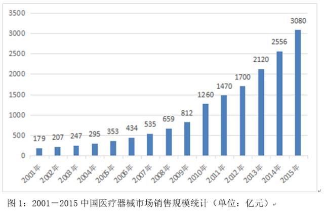 據中國醫藥物資協會醫療器械分會抽樣調查統計,2015全年中國醫療器械市場銷售規模約為3080億元,比2014年度的2556億元增長了524億元,平均增長率約為20.05%。