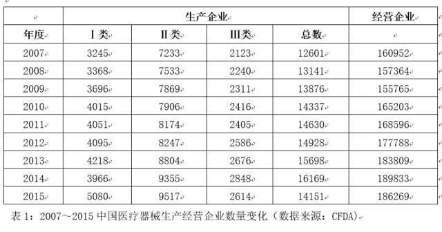 藍皮書指出,自 2007 年以來,我國醫療器械生產企業無論是Ⅰ類、 Ⅱ類、Ⅲ類都在穩步增長,8年間總量由 1.26 萬家增長到了2014年的1.6萬多家,年均增長率約3%。