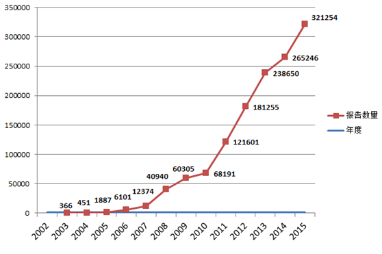 圖1-1 2002-2015年全國可疑醫療器械不良事件報告數量
