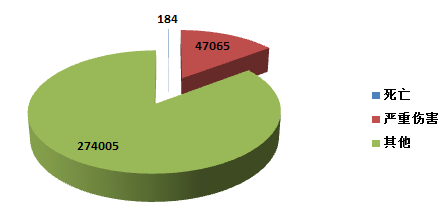 2015年,全國上報的可疑醫療器械不良事件報告中,事件傷害為死亡的報告共184份,占總報告數的0.05%;事件為嚴重傷害的報告共 47,065份,占總報告數的14.7%;事件傷害為其他的報告共274,005份,占總報告數的85.2%(圖2-2)。2015年,各類傷害程度的報告絕對數量均有所增加,其所占比例與2014年相似。