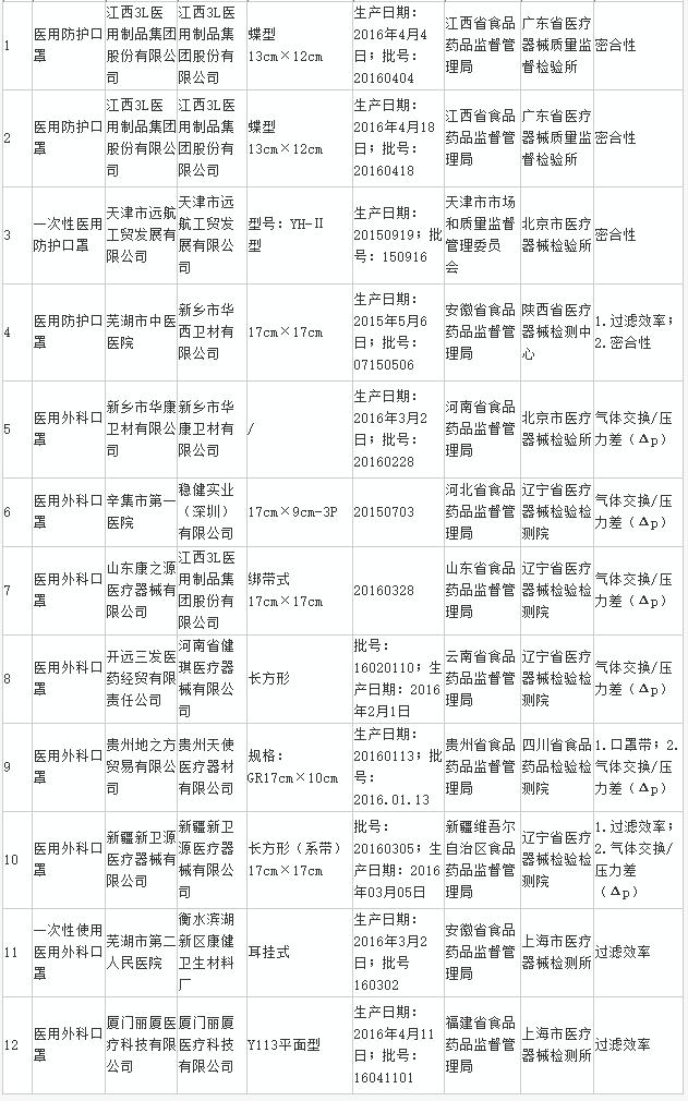 (一)醫(yī)用防護口罩3家企業(yè)4批產品。江西3L醫(yī)用制品集團股份有限公司生產的2批醫(yī)用防護口罩、天津市遠航工貿發(fā)展有限公司生產的1批一次性醫(yī)用防護口罩,密合性不符合標準規(guī)定;新鄉(xiāng)市華西衛(wèi)材有限公司生產的1批醫(yī)用防護口罩,過濾效率、密合性不符合標準規(guī)定。