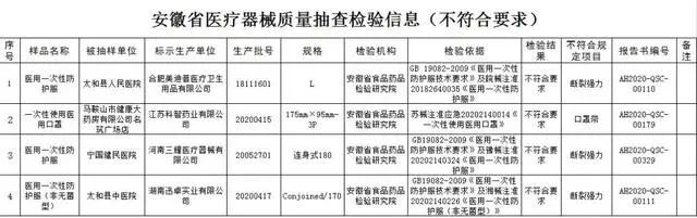 其中,在太和縣人民醫(yī)院抽樣的,標(biāo)示為合肥美迪普醫(yī)療衛(wèi)生用品有限公司生產(chǎn)的醫(yī)用一次性防護(hù)服,生產(chǎn)批號18111601,規(guī)格L;寧國健民醫(yī)院抽樣的,標(biāo)示為河南三耀醫(yī)療器械有限公司生產(chǎn)的醫(yī)用一次性防護(hù)服,生產(chǎn)批號20052701,規(guī)格連身式180;太和縣中醫(yī)院抽樣的,標(biāo)示為湖南迅卓實(shí)業(yè)有限公司生產(chǎn)的醫(yī)用一次性防護(hù)服(非無菌型),生產(chǎn)批號20200417,規(guī)格Conjoined/170;均斷裂強(qiáng)力不符合要求。