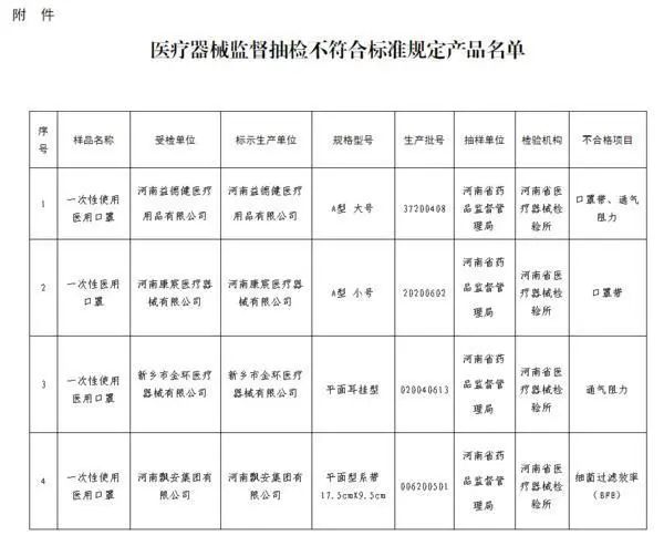 1.河南益德健醫(yī)療用品有限公司生產(chǎn)的1批次一次性使用醫(yī)用口罩,規(guī)格型號:A型大號,生產(chǎn)日期:2020年4月8日,生產(chǎn)批號:37200408,不合格項(xiàng)目:口罩帶、通氣阻力。