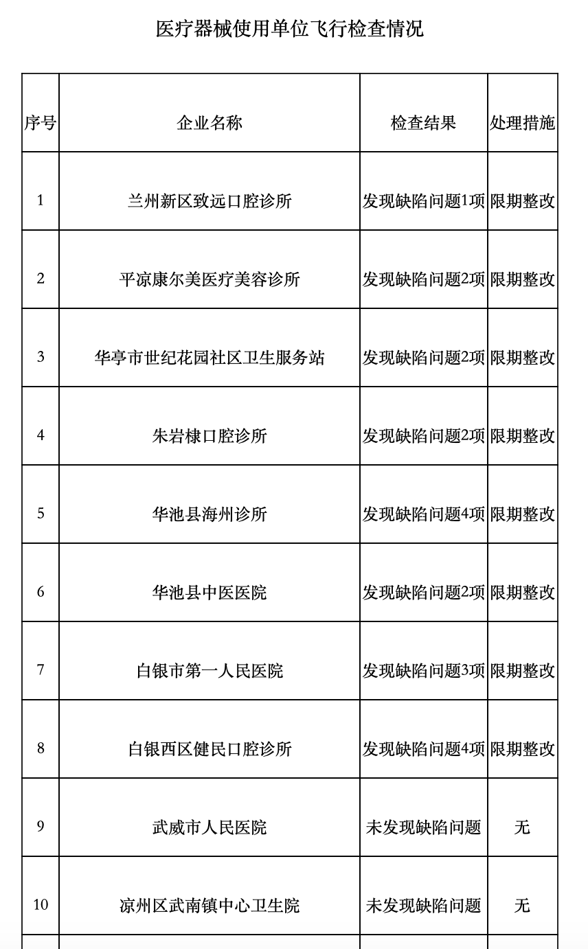 12月11日, 甘肅省藥品監(jiān)督管理局網(wǎng)站發(fā)布的《關(guān)于2020年度部分醫(yī)療器械使用單位飛行檢查情況的通告》顯示,根據(jù)《醫(yī)療器械監(jiān)督管理?xiàng)l例》《醫(yī)療器械使用質(zhì)量監(jiān)督管理辦法》等法規(guī)、規(guī)章規(guī)定,2020年11月16日-11月25日,甘肅省藥品監(jiān)督管理局組織檢查組對省內(nèi)部分醫(yī)療器械使用單位進(jìn)行了飛行檢查。