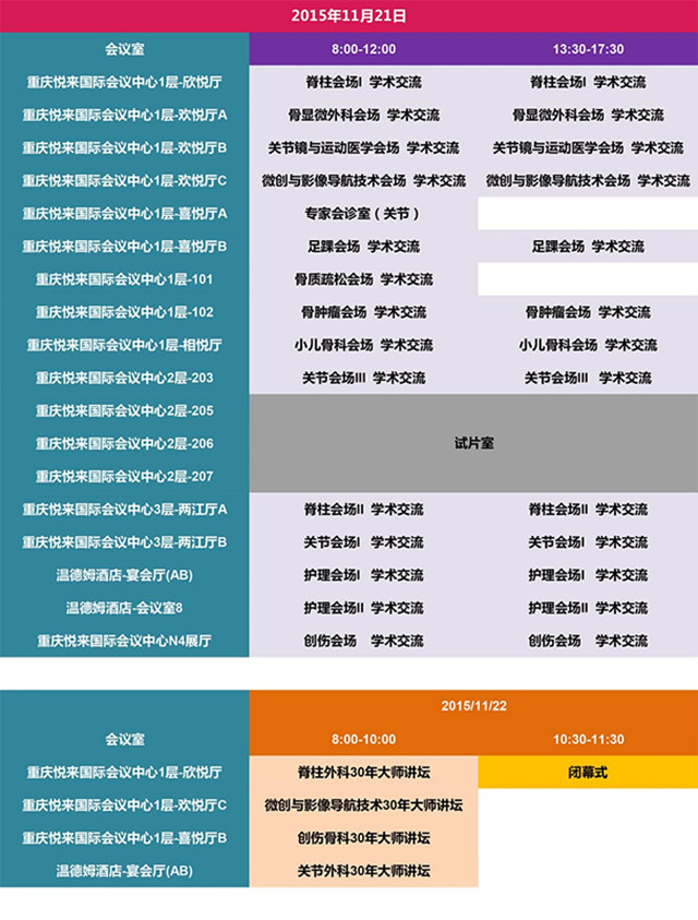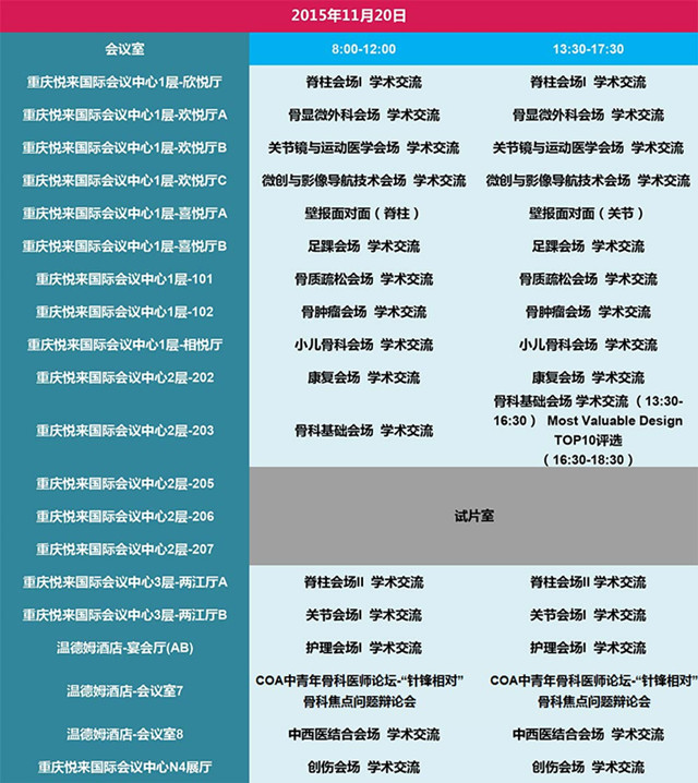 11月20、21日兩天,脊柱、關節、創傷、骨腫瘤、關節鏡與運動醫學、微創、骨質疏松、足踝外科、骨科基礎、骨科護理、骨顯微修復、小兒骨科、康復、中西醫結合等各專業學組將以大會發言、專題討論、病例討論及壁報展示等多種交流形式,集中體現一年來在各自領域所取得的最新研究成果,展示最新技術和臨床進展。