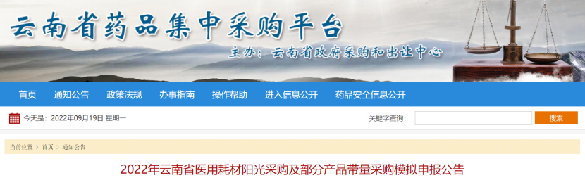 近日,云南省醫藥集中采購平臺發布《2022年云南省醫用耗材陽光采購及部分產品帶量采購模擬申報公告》,擬開展2022年云南省醫用耗材陽光采購及部分產品帶量采購的申報工作,并組織模擬申報。