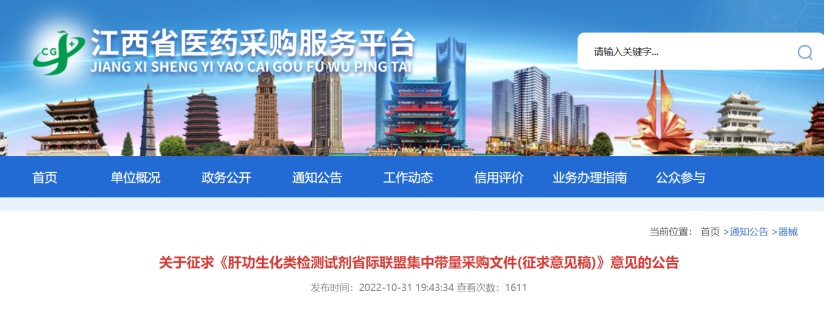 10月31日,江西省醫(yī)藥采購(gòu)服務(wù)平臺(tái)《關(guān)于征求<肝功生化類(lèi)檢測(cè)試劑省際聯(lián)盟集中帶量采購(gòu)文件(征求意見(jiàn)稿)>意見(jiàn)的公告》(以下簡(jiǎn)稱(chēng)《意見(jiàn)稿》)。