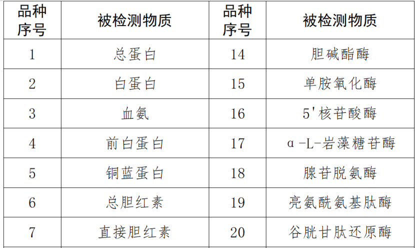本次帶量采購(gòu)的品種,是指按醫(yī)療器械管理的用于人體樣本體外檢測(cè)的單品種液體生化診斷試劑,具體被檢測(cè)物質(zhì)詳見(jiàn)下表。