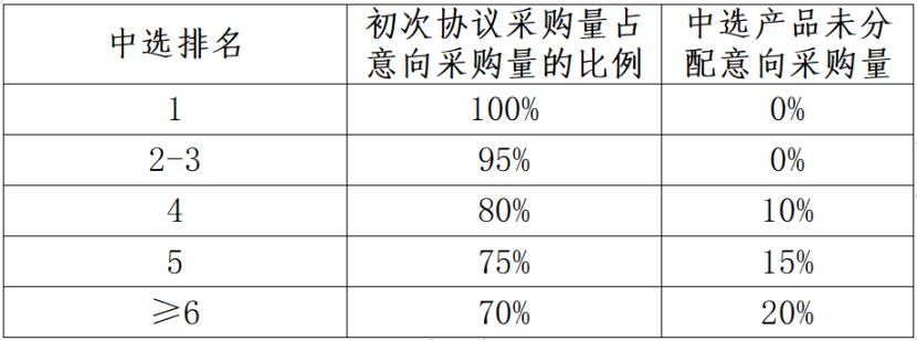 第一步:按中選排名確定初次協(xié)議采購(gòu)量,初次協(xié)議采購(gòu)量占意向采購(gòu)量的比例見(jiàn)下表。根據(jù)醫(yī)療機(jī)構(gòu)的意向采購(gòu)量,四舍五入取整,計(jì)算各品種各企業(yè)的初次協(xié)議采購(gòu)量。