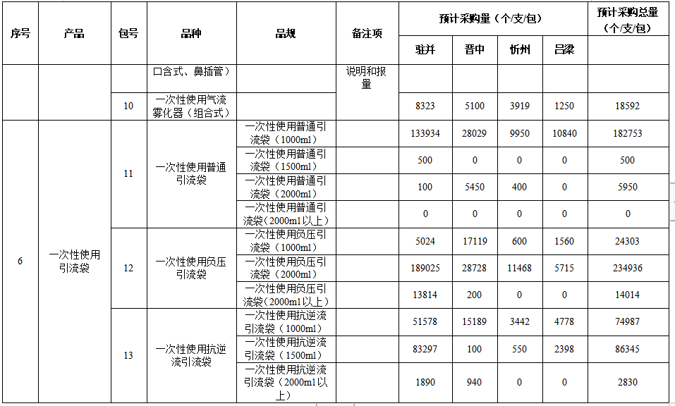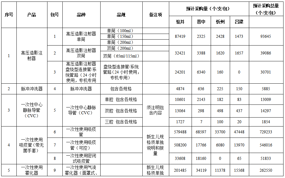 本次集中談判議價(jià)采購(gòu)的耗材有六類,分為13個(gè)采購(gòu)包,包括:高壓造影注射器、脈沖沖洗器、一次性中心靜脈導(dǎo)管(CVC)、一次性使用吸痰管(帶無(wú)菌手套)、一次性使用霧化器、一次性使用引流袋。