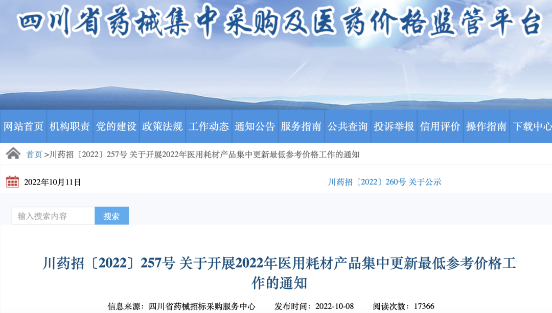 10月8日,四川省藥械集中采購平臺發(fā)布《關(guān)于開展2022年醫(yī)用耗材產(chǎn)品集中更新最低參考價格工作的通知》(以下簡稱“通知”)。