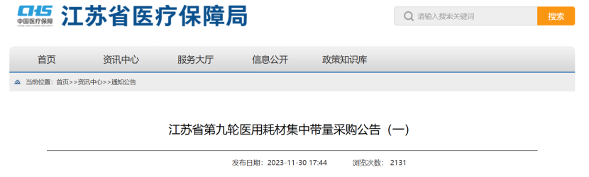 12月2日,江蘇醫保局發布《江蘇省第九輪醫用耗材集中帶量采購公告(一)》(以下簡稱《公告》),決定開展省第九輪醫用耗材集中帶量采購。