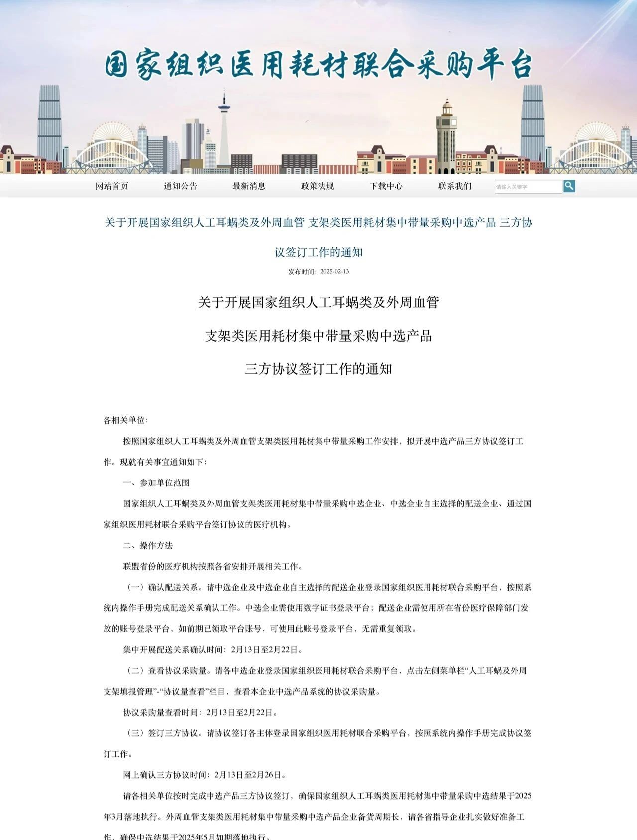 近日,國(guó)家組織高值醫(yī)用耗材聯(lián)合采購(gòu)辦公室發(fā)布《關(guān)于開(kāi)展國(guó)家組織人工耳蝸類(lèi)及外周血管支架類(lèi)醫(yī)用耗材集中帶量采購(gòu)中選產(chǎn)品三方協(xié)議簽訂工作的通知》(簡(jiǎn)稱(chēng)《通知》)。