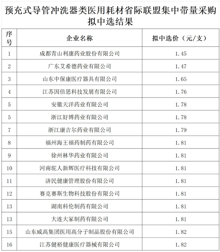 結果顯示,共16家企業獲擬中選資格,中選價格區間為1.45元/支到1.82元/支。