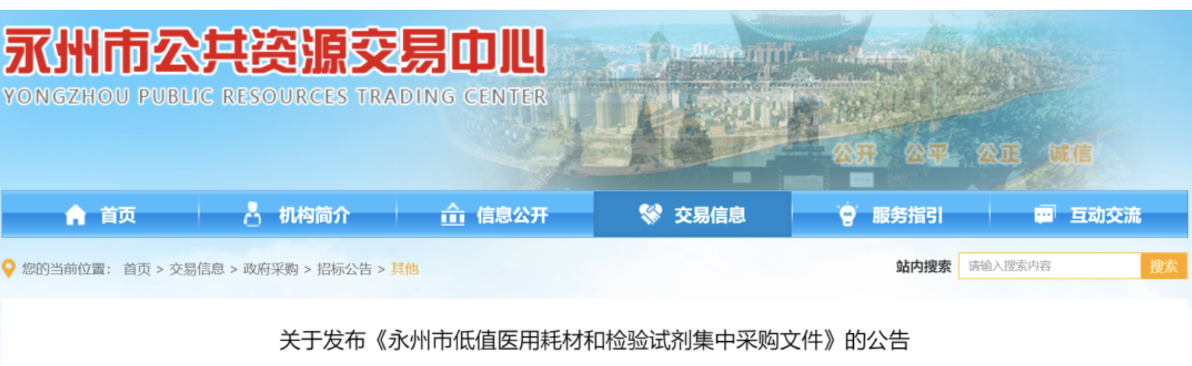 近日,湖南省永州市醫(yī)療保障局發(fā)布《永州市低值醫(yī)用耗材和檢驗試劑集中采購文件》的公告。