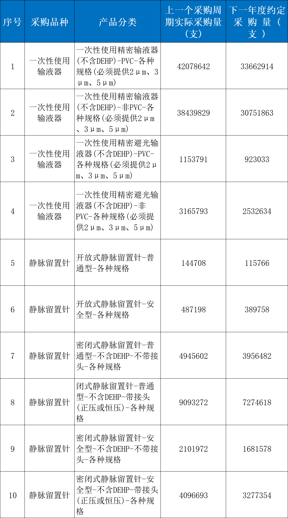 本次續(xù)約品種為一次性使用輸液器和靜脈留置針類,采購周期為兩年,參照醫(yī)療機構(gòu)的實際使用量,下一年度約定采購量不少于上一個采購周期采購量的80%。