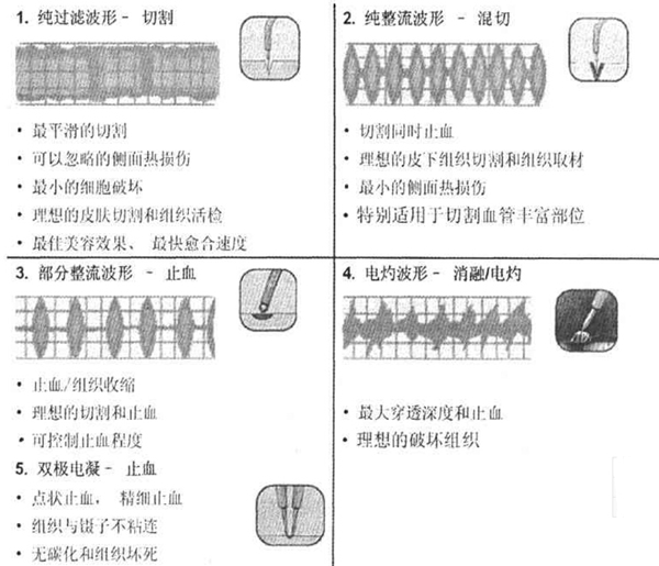 3)部分整流波形(partically rectified waveform):這種波形適用于直接和非直接止血技術。其能量的90%用于凝血,10%用于切割。使用這種波形凝血不會引起組織的焦化和壞死,縮短了治愈時間。凝血時組織不會粘連到發射極/刀頭,減少了手術障礙。這種波形可以既可以用于單極止血也可以用于雙極止血。