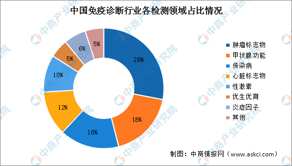根據中商產業研究院統計,從免疫診斷行業各個細分市場來看,腫瘤標志物檢測、甲狀腺功能檢測和傳染病檢測是我國免疫診斷項目中,規模排名前三的領域。其中腫瘤標志物檢測項目市場最大,占比達到28%。