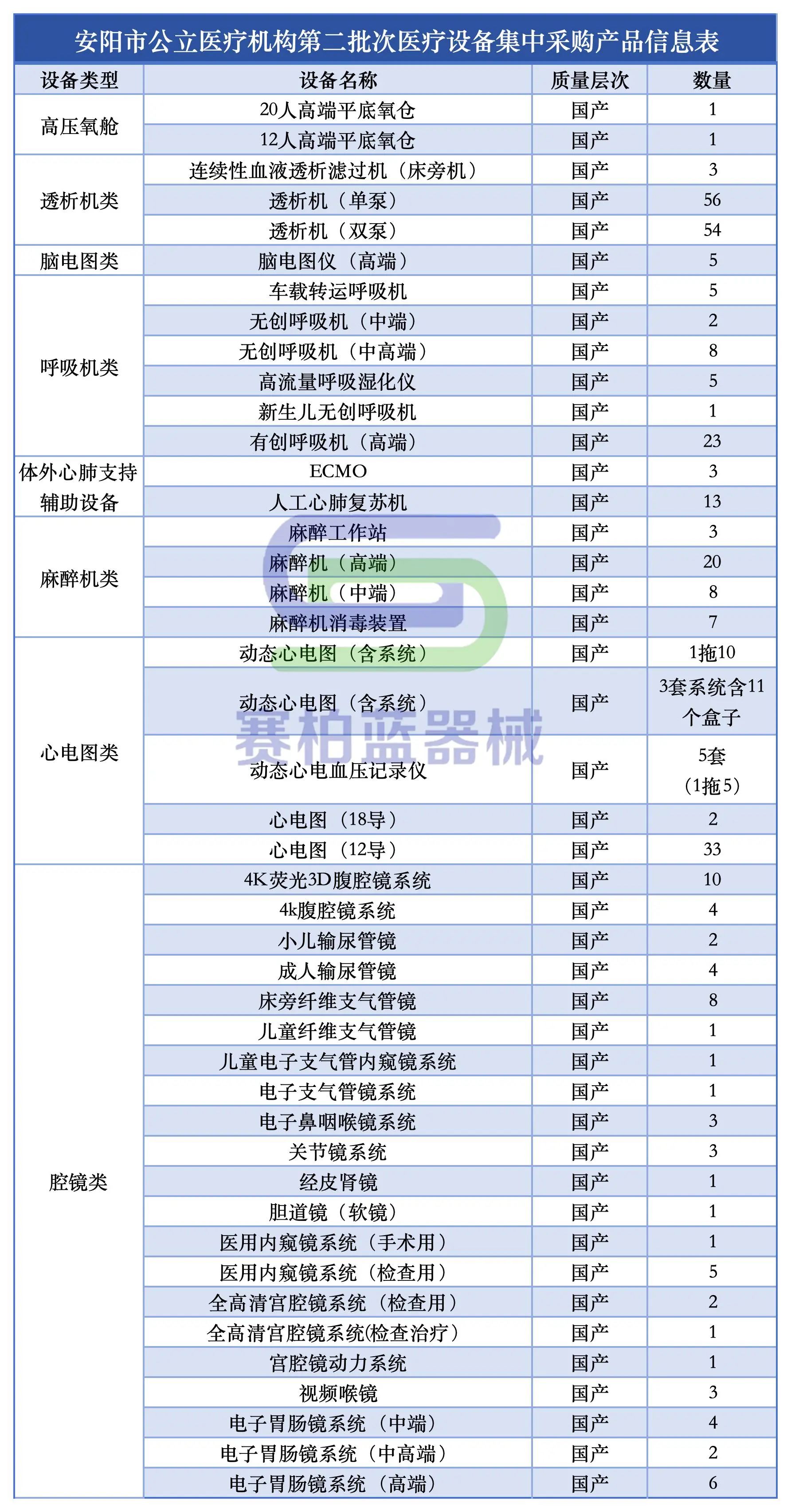 河南安陽(yáng)市公立醫(yī)療機(jī)構(gòu)醫(yī)療設(shè)備集中采購(gòu)聯(lián)合體計(jì)劃開(kāi)展第二批次醫(yī)療設(shè)備采購(gòu),設(shè)備集中采購(gòu)實(shí)行打包形式公開(kāi)招標(biāo),3月已明確了第二次市場(chǎng)調(diào)研會(huì)相關(guān)事宜。安陽(yáng)此次擬采購(gòu)高壓氧艙、透析機(jī)類、腦電圖類、呼吸機(jī)類、體外心肺支持輔助設(shè)備、麻醉機(jī)類、心電圖類、腔鏡類設(shè)備,包括高端呼吸機(jī)、高端電子胃腸鏡、ECMO等在內(nèi)的諸多設(shè)備,全部要求國(guó)產(chǎn)。