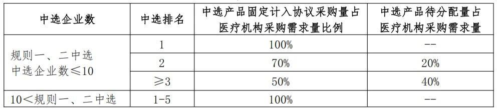 規(guī)則四為申報(bào)企業(yè)進(jìn)一步托底,通過(guò)規(guī)則一、二、三均未獲得擬中選資格的申報(bào)企業(yè),若申報(bào)價(jià)格不高于最高有效申報(bào)價(jià)格,復(fù)活為擬中選企業(yè),只是在分量上居于末席。在保障企業(yè)中選的同時(shí),也并未喪失集采擠出虛高價(jià)格水分的初心。