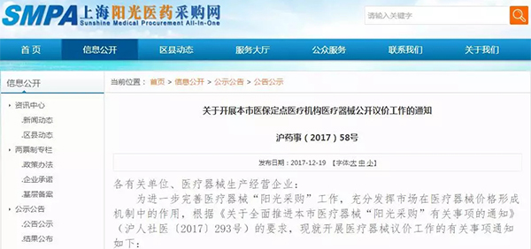 12月19日,上海陽(yáng)光醫(yī)藥采購(gòu)網(wǎng)發(fā)布《關(guān)于開(kāi)展本市醫(yī)保定點(diǎn)醫(yī)療機(jī)構(gòu)醫(yī)療器械公開(kāi)議價(jià)工作的通知》(以下簡(jiǎn)稱《通知》),明確“公開(kāi)議價(jià)”的流程,是醫(yī)療機(jī)構(gòu)發(fā)起議價(jià),終端企業(yè)確認(rèn)價(jià)格,雙方自主議定的結(jié)果即為采購(gòu)價(jià)。該價(jià)格僅對(duì)本醫(yī)療機(jī)構(gòu)有效。