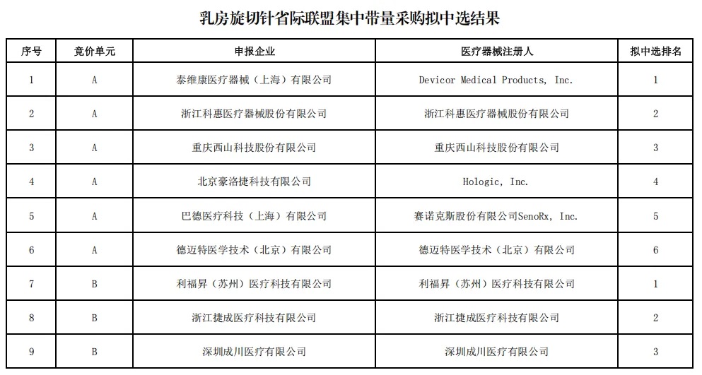 12月17日,浙江醫(yī)保局發(fā)布《乳房旋切針省際聯(lián)盟集中帶量采購(gòu)擬中選結(jié)果公示》。