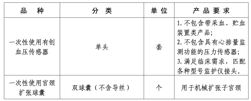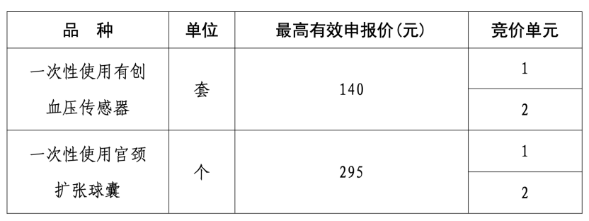 其中,一次性使用有創血壓傳感器、一次性使用宮頸擴張球囊產品要求及最高有效申報價如下:
