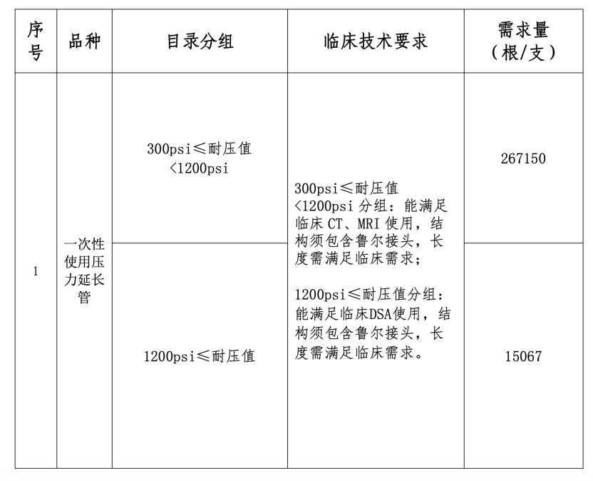 一次性使用壓力延長管、注射器采購品種、分組情況、采購需求量如下: