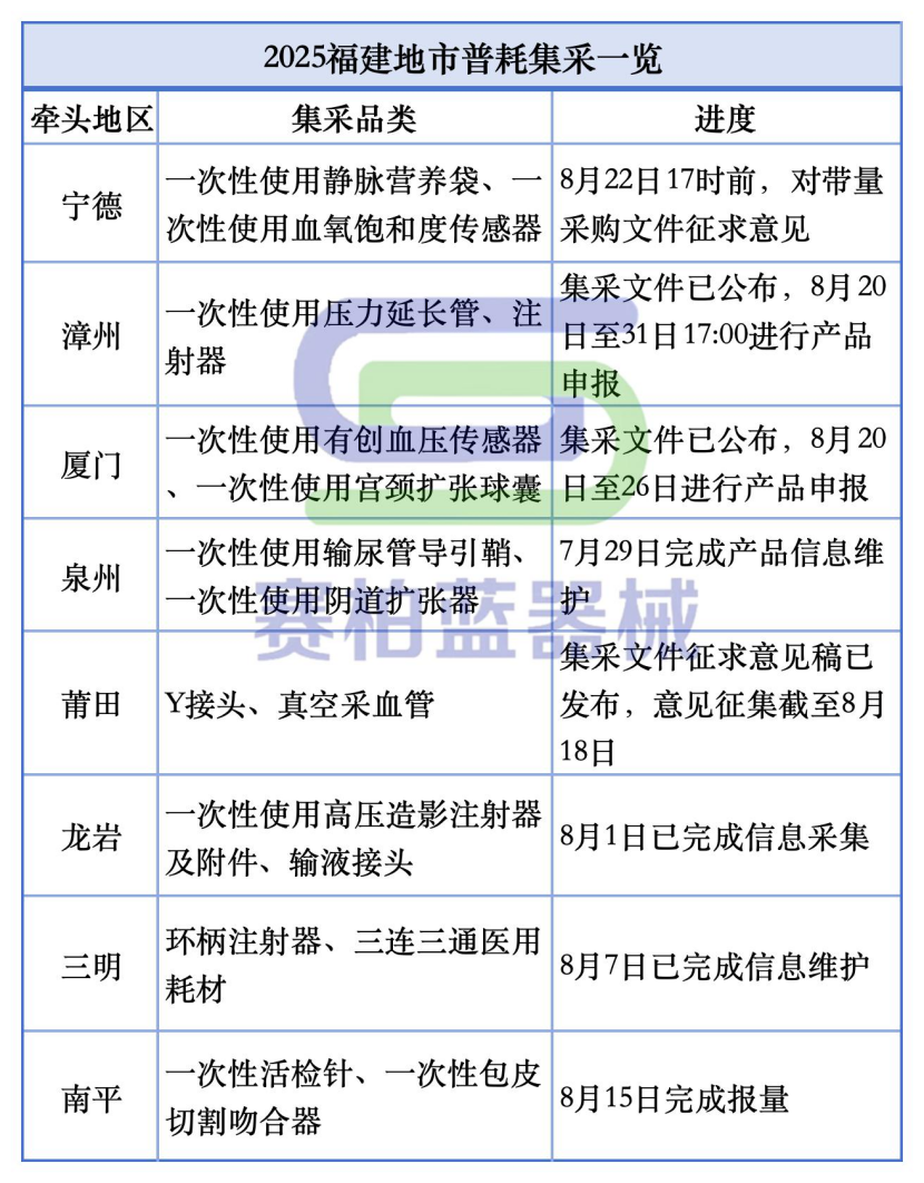 截至目前,福建漳州、廈門、寧德、南平、漳州、泉州、莆田、龍巖、三明均已發布相關通知,采購品類以低值耗材為主。