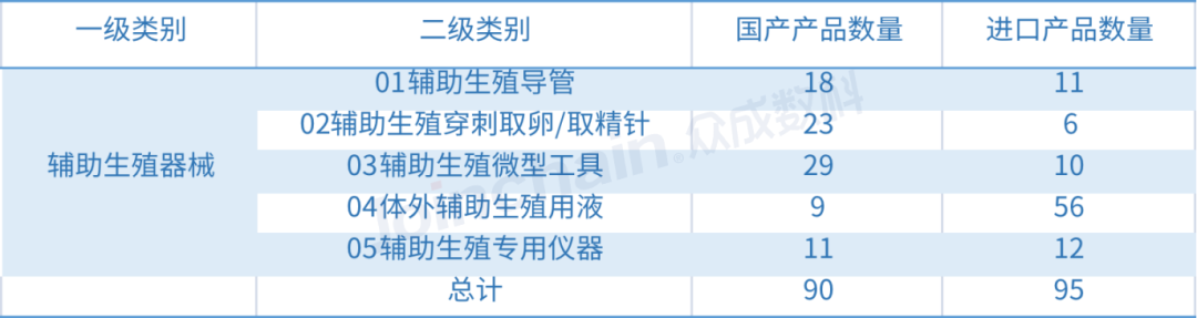 據眾成數科統(tǒng)計,截止到2022年4月30日,我國輔助生殖器械的有效注冊產品數為185件,國產產品90件,進口產品95件。其中輔助生殖導管29件,輔助生殖穿刺取卵/取精針29件,輔助生殖微型工具39件,體外輔助生殖用液65件,輔助生殖專用儀器23件。
