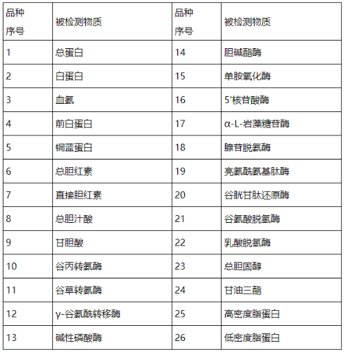 本次品種為按醫療器械管理的用于人體樣本體外檢測的單品種液體生化診斷試劑,具體被檢測物質如下: