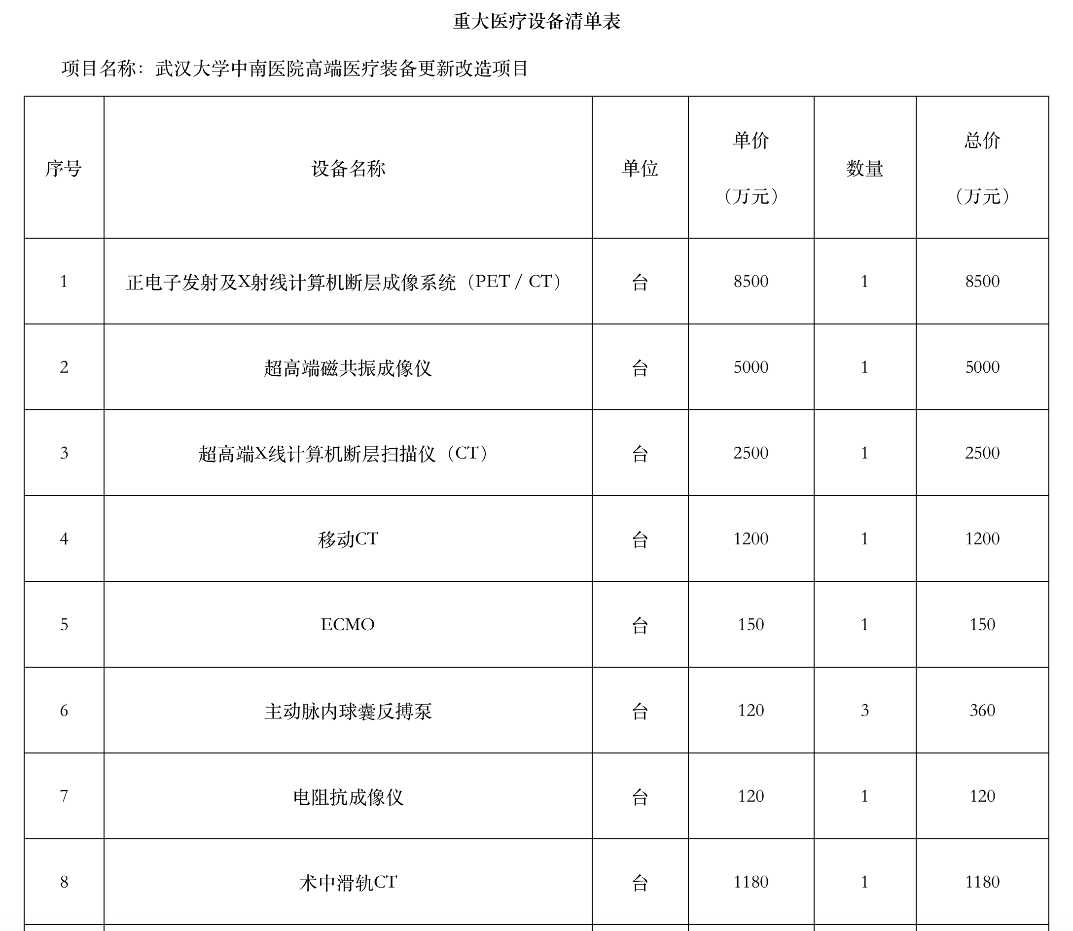 近日,湖北省發(fā)改委發(fā)布《關(guān)于調(diào)整武漢大學(xué)中南醫(yī)院高端醫(yī)療裝備更新改造項(xiàng)目可行性研究報(bào)告的批復(fù)》。同意將武漢大學(xué)中南醫(yī)院高端醫(yī)療裝備更新改造項(xiàng)目更新購(gòu)置設(shè)備數(shù)量由3臺(tái)(套)調(diào)整為57臺(tái)(套),總投資由16000萬(wàn)元調(diào)整為25999.5萬(wàn)元。