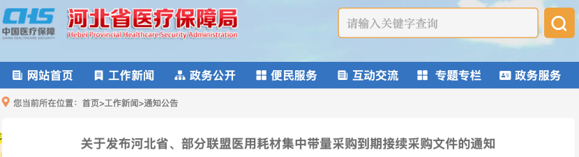 2月8日,河北省醫(yī)保局發(fā)布《關于發(fā)布河北省、部分聯(lián)盟醫(yī)用耗材集中帶量采購到期接續(xù)采購文件的通知》(附文末)。