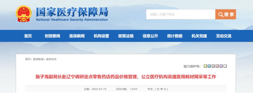 近日,國家醫保局黨組成員、副局長施子海帶隊赴遼寧調研定點零售藥店藥品價格管理、公立醫療機構高值醫用耗材網采等工作,實地調研定點零售藥店和醫療機構,聽取定點零售藥店、連鎖公司和醫療機構相關負責同志和代表的意見建議。