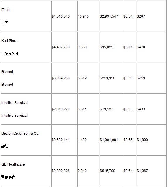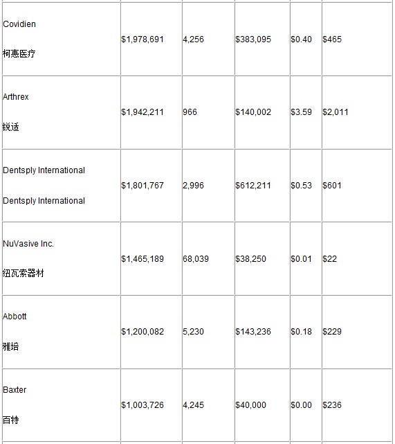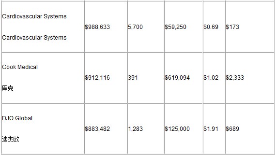 MassDevice.com的分析數據表明,醫療儀器公司總共付款48.1萬次,支付了$1.99億美元。最高單筆支付為美敦力公司(紐約證券交易所代碼:MDT)的$300萬美元的特許權使用費。一些公司公布付款低至1美分,有的甚至是$0美元。根據數據庫,平均付款為$414美元。