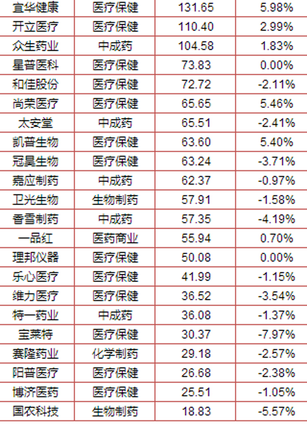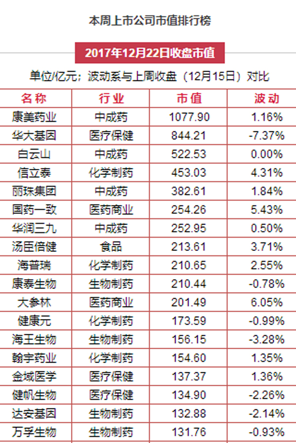 另外,從市值表現來看,本周有16家公司市值上漲,漲幅靠前的有大參林、宜華健康等公司;21家公司市值下跌,跌幅較大的有寶萊特、華大基因等公司。