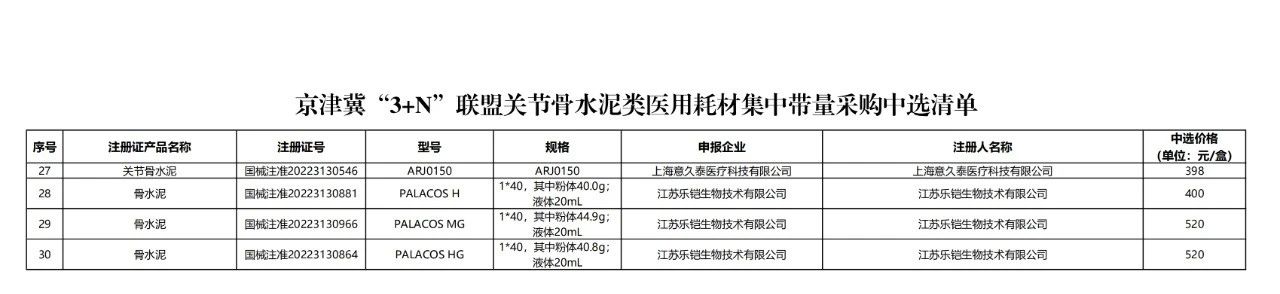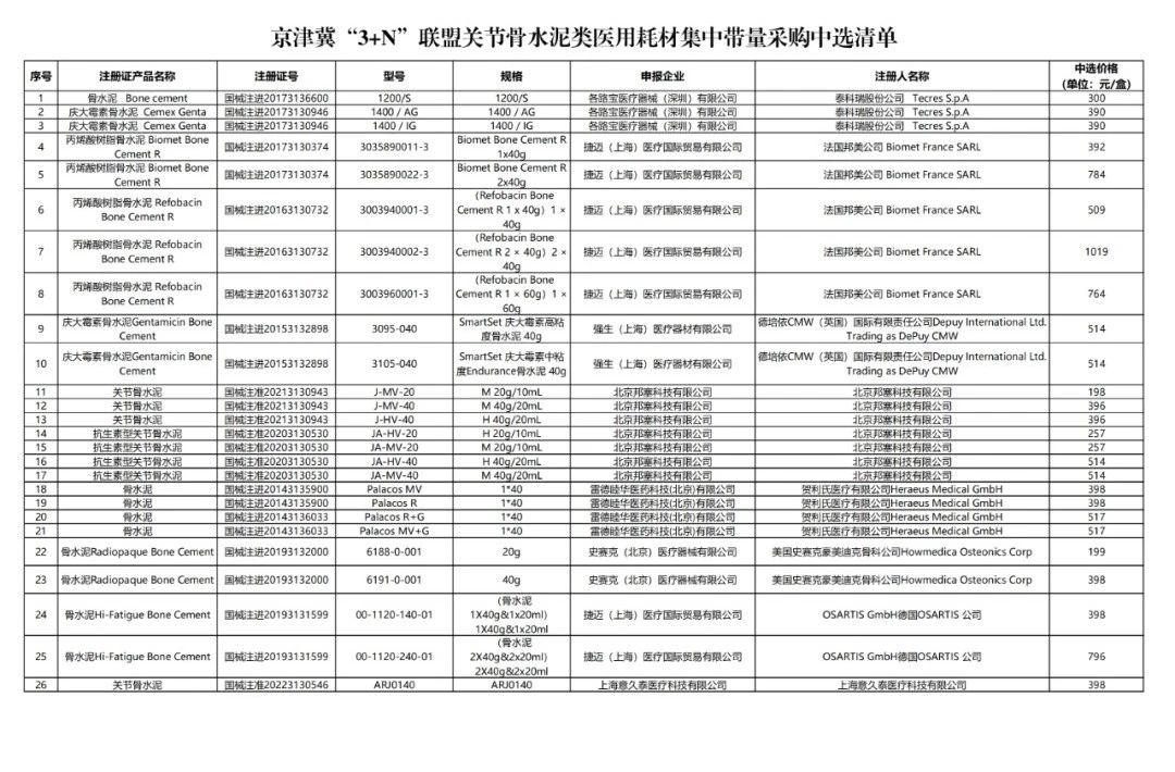 6月12日,京津冀“3+N”醫藥聯盟采購辦公室發布了《關于公布京津冀“3+N”聯盟關節骨水泥類醫用耗材集中帶量采購中選結果的通知》(簡稱《通知》),公布了中選企業,以及中選產品的具體型號、規格和以(元/盒)為單位的中選價格。
