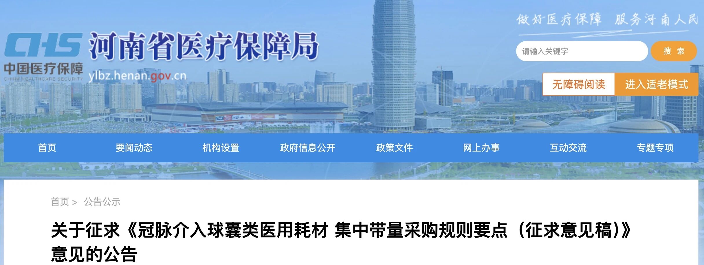 9月11日,河南醫保局發布《冠脈介入球囊類醫用耗材 集中帶量采購規則要點(征求意見稿)》(完整見文末),意見征求截止時間為9月15日18時。